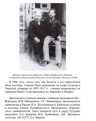 Бородинская пресноводная биологическая станция была основана в 1895 г. на Бологовском озере крупным ученым-ботаником, первым президентом Русского ботанического общества — Иваном Парфеньевичем Бородиным . В 1906 г. станция переехала на о. Селигер, а в 20-х годах продолжила свою работу в Карелии. Позднее на ее базе была создана Кончезерская биостанция, переданная Петрозаводскому государственному университету.